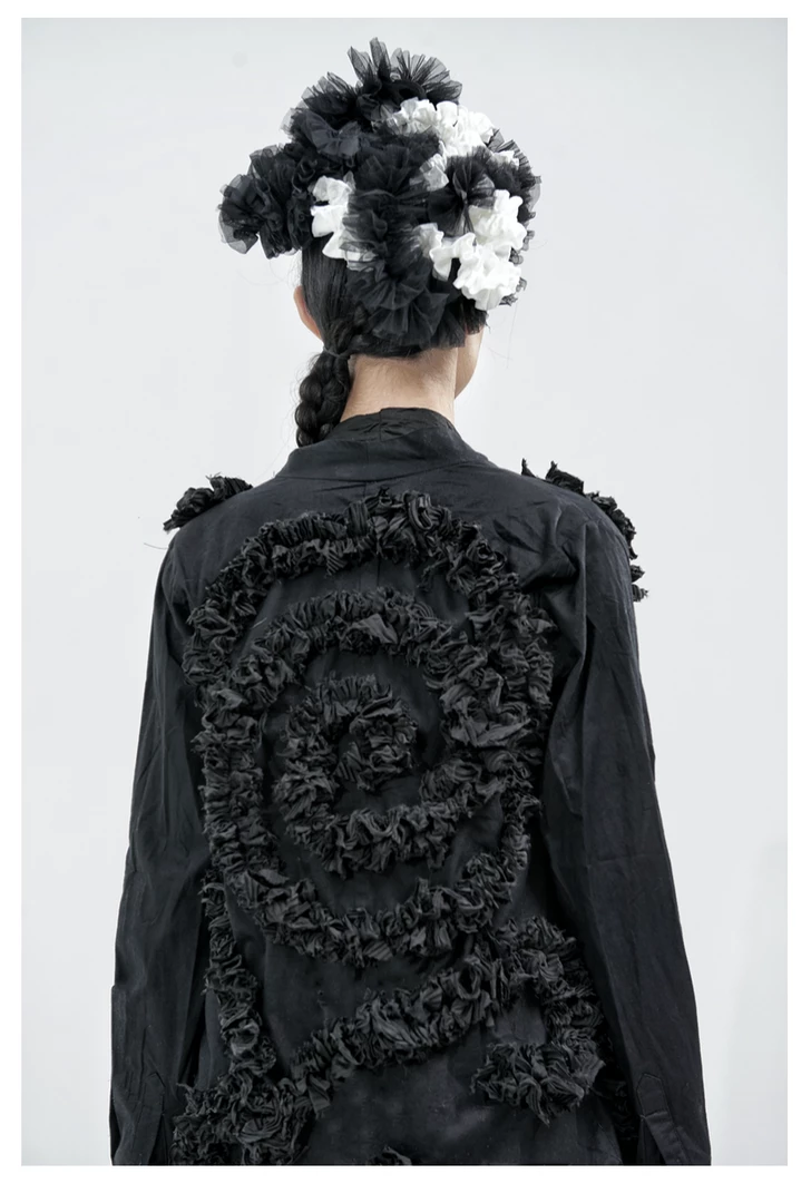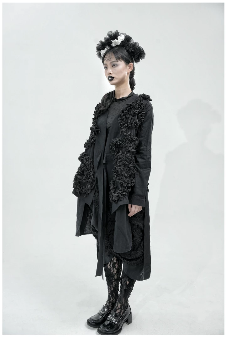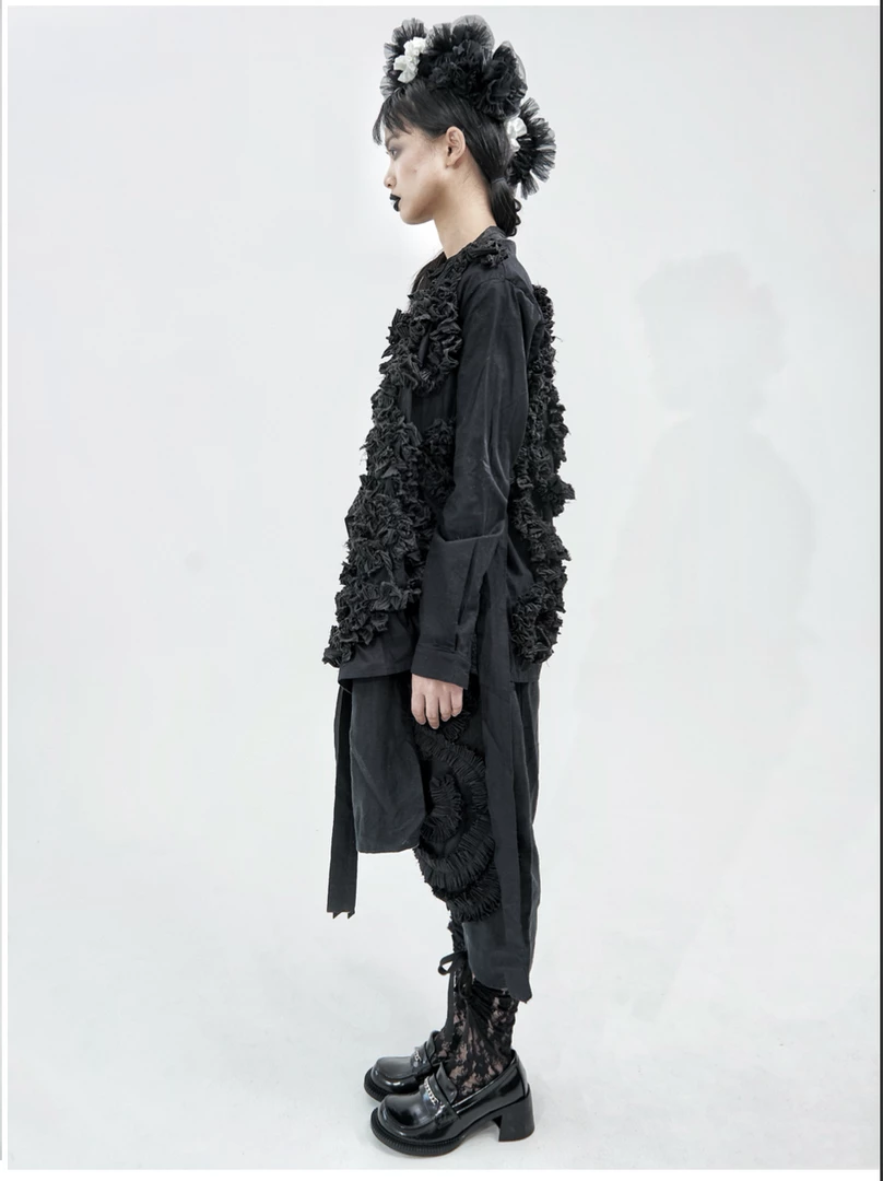 Mariposa uses complex drape structure design and deconstruction elements, as she pays attention to the clothing silhouette and tailoring. She dominates traditional fashion design with drape and three-dimensional deconstructed geometric patterns, asymmetrical overlapping, innovative tailoring with neat lines and somber tones of black and withes to present an ideological aesthetic.