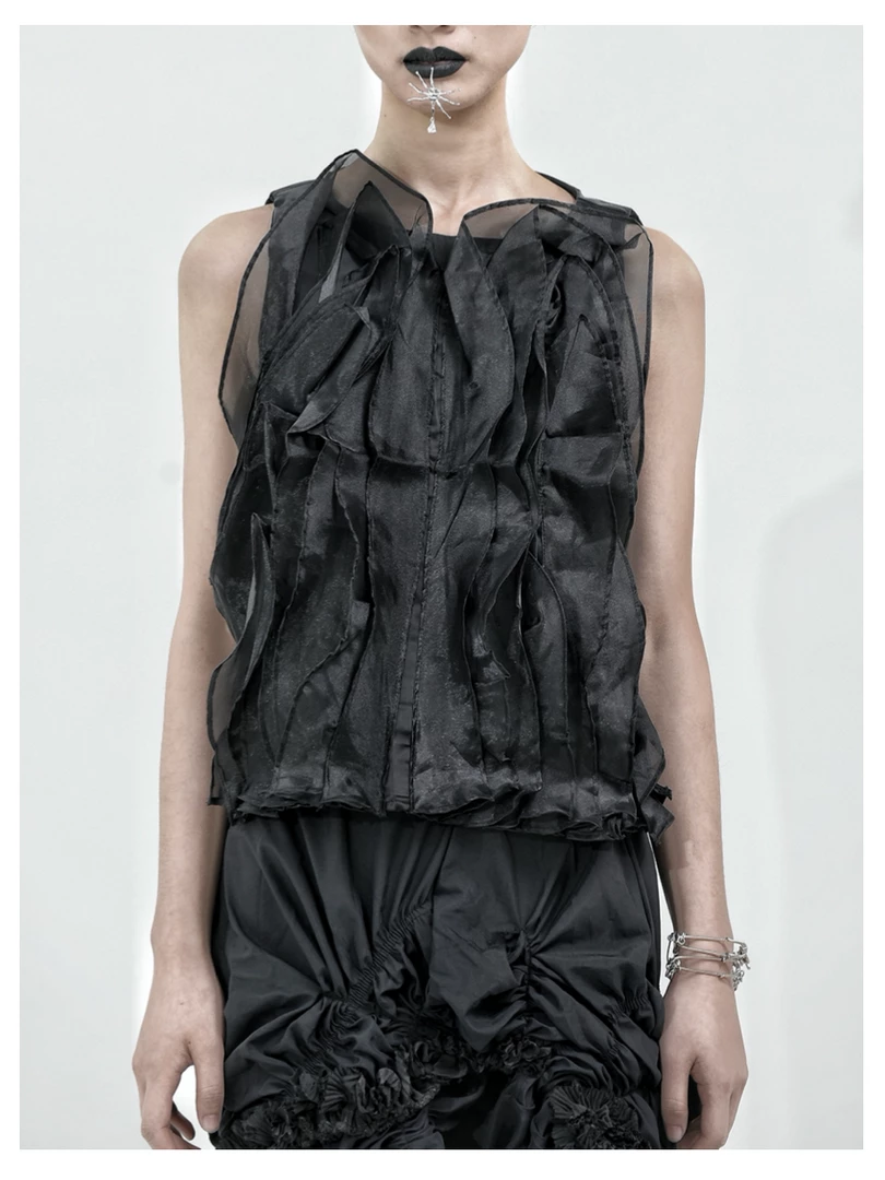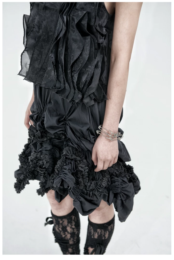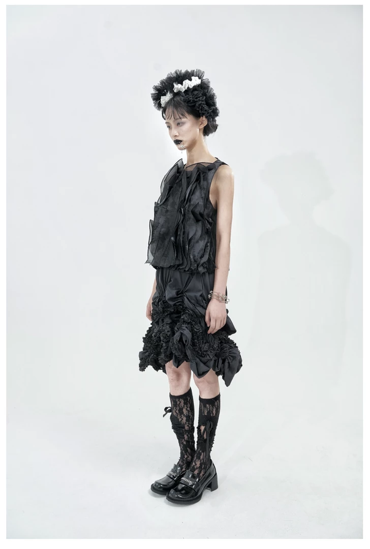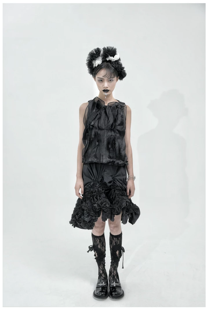 Mariposa uses complex drape structure design and deconstruction elements, as she pays attention to the clothing silhouette and tailoring. She dominates traditional fashion design with drape and three-dimensional deconstructed geometric patterns, asymmetrical overlapping, innovative tailoring with neat lines and somber tones of black and withes to present an ideological aesthetic.
