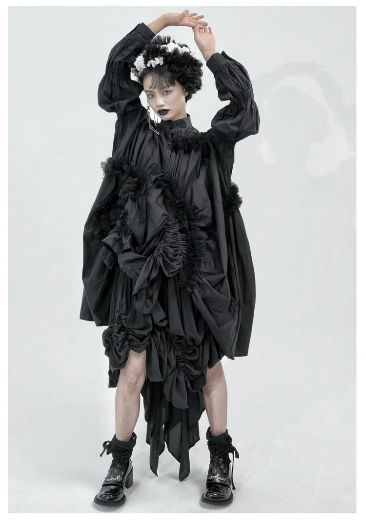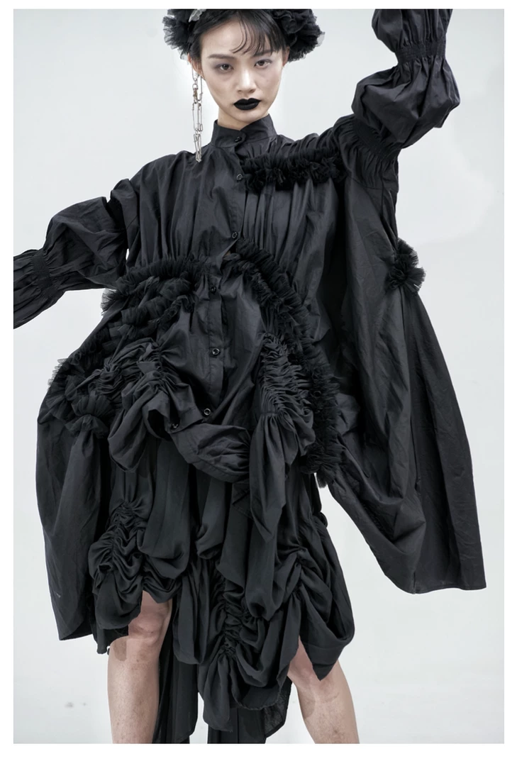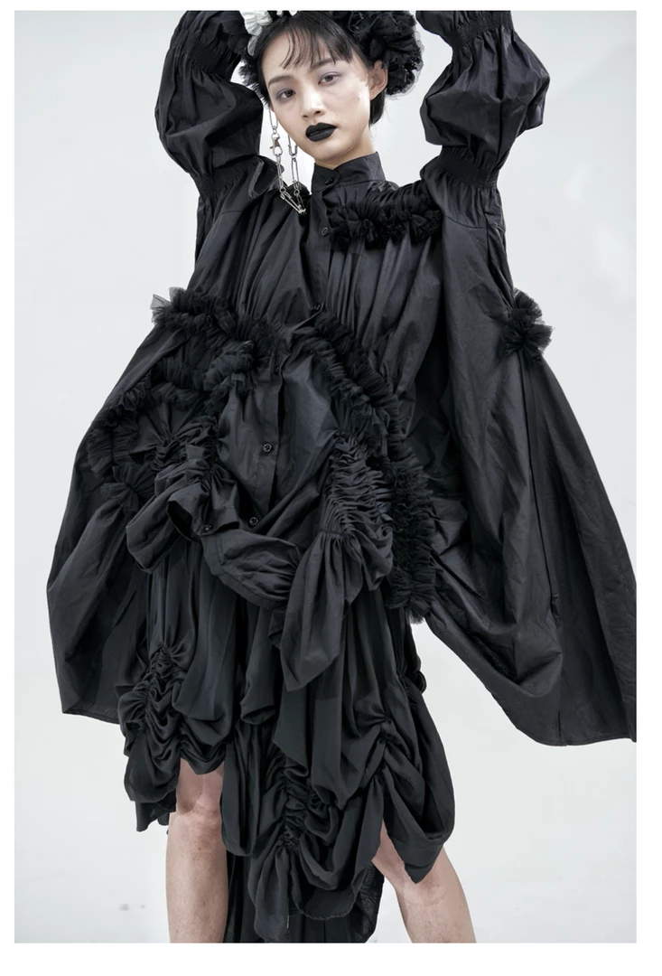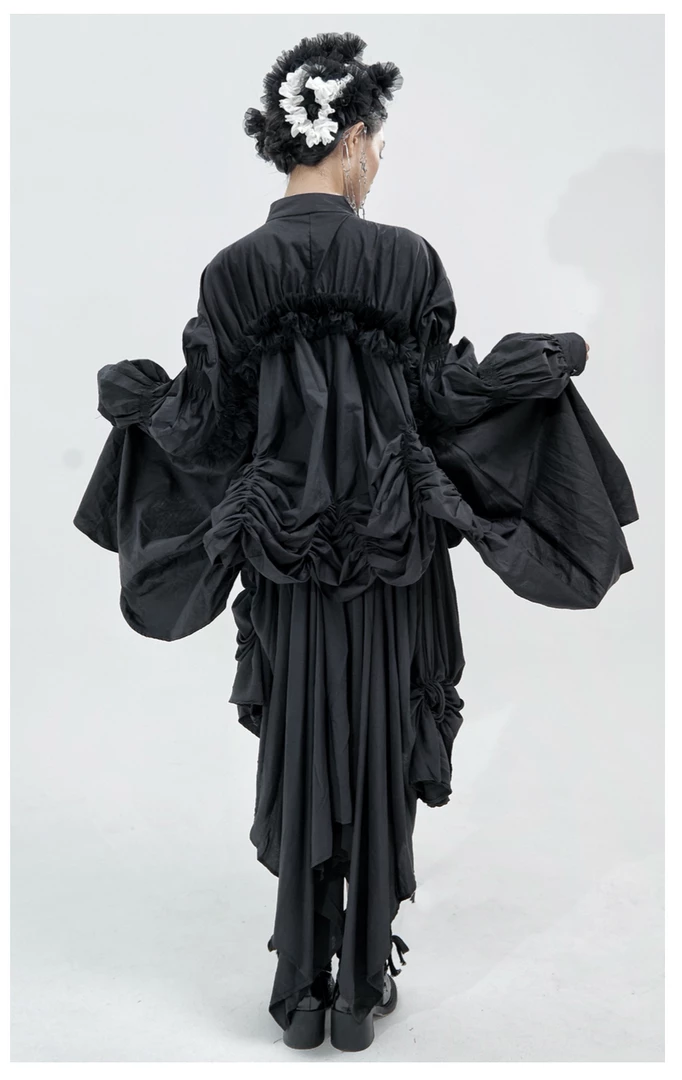 Mariposa uses complex drape structure design and deconstruction elements, as she pays attention to the clothing silhouette and tailoring. She dominates traditional fashion design with drape and three-dimensional deconstructed geometric patterns, asymmetrical overlapping, innovative tailoring with neat lines and somber tones of black and withes to present an ideological aesthetic.