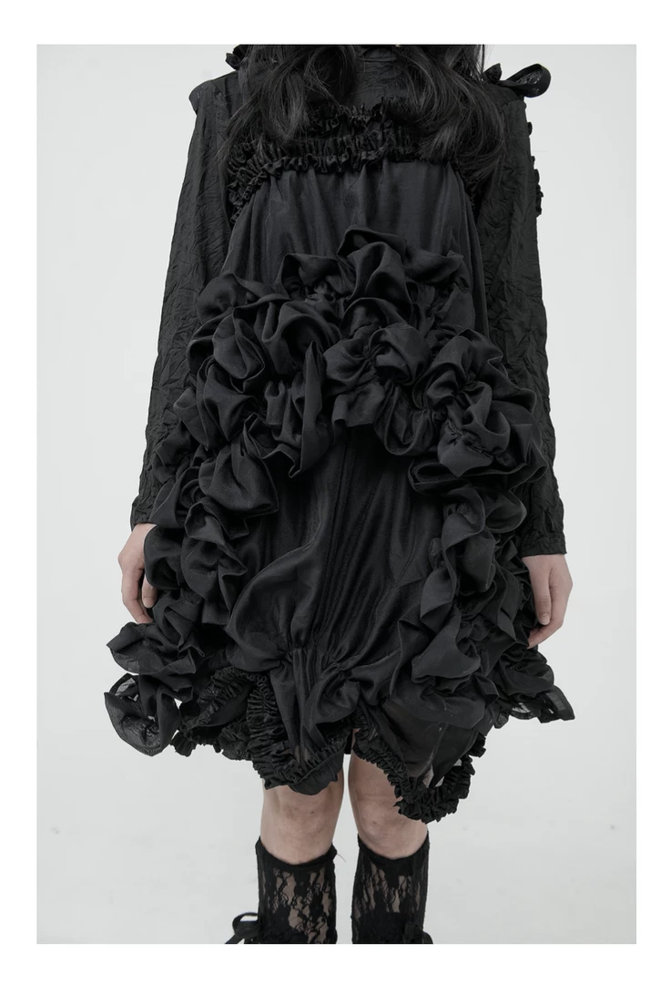 Mariposa uses complex drape structure design and deconstruction elements, as she pays attention to the clothing silhouette and tailoring. She dominates traditional fashion design with drape and three-dimensional deconstructed geometric patterns, asymmetrical overlapping, innovative tailoring with neat lines and somber tones of black and withes to present an ideological aesthetic.