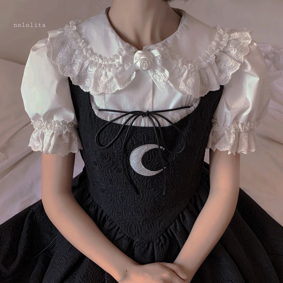 The cotton lace on the edges are made with small roses, the ribbon is a classical vintage rose pattern, the chest brooch is a satin rose, and the waist is a hand-stitched three-dimensional rose.