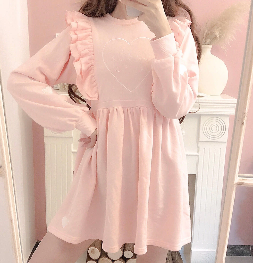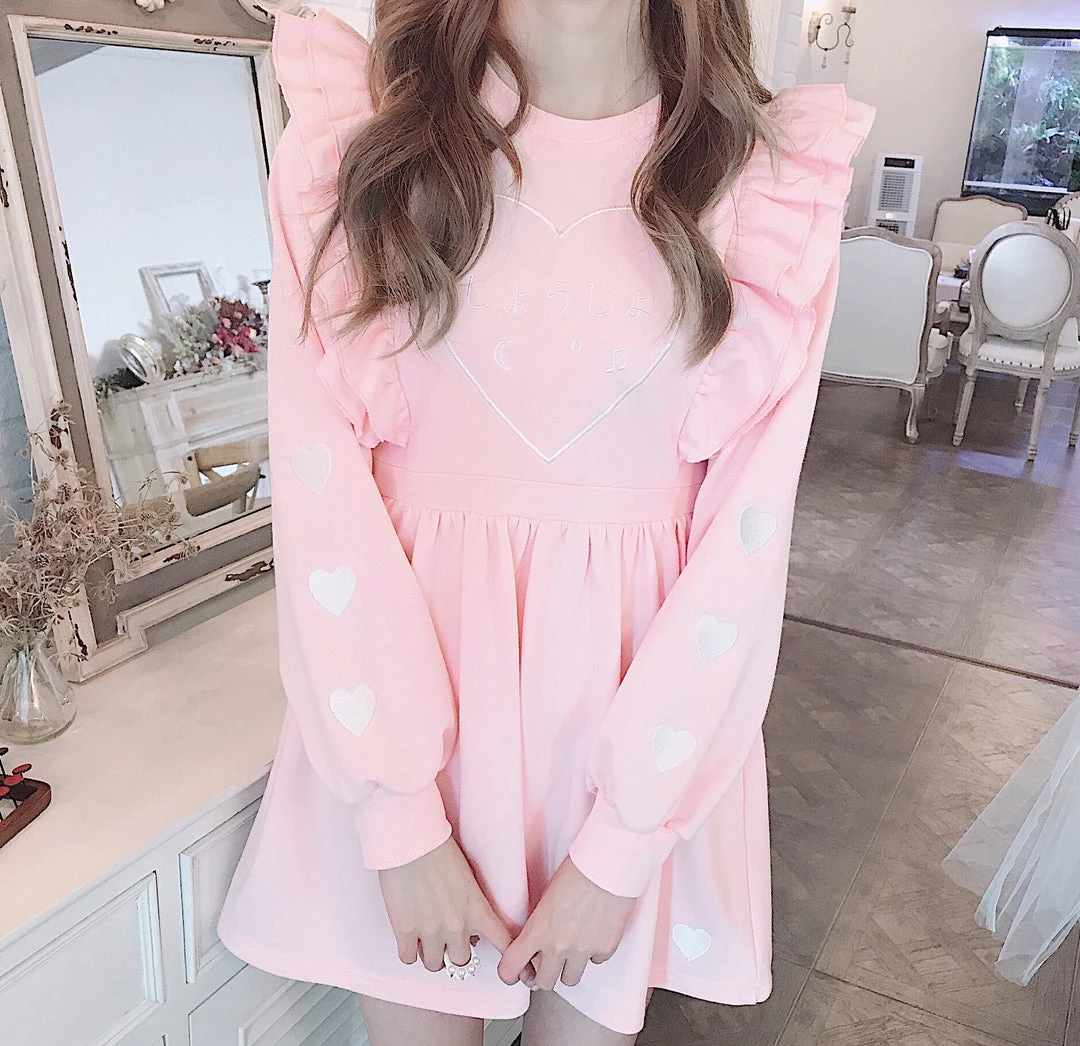 Lovely Japanese “Sweet girl” 少女 しょじお letters embroidered on the front, cute hearts on both sleeves with Larmekei styled flouncing cut as decoration on the front which gives you extra sweet looking