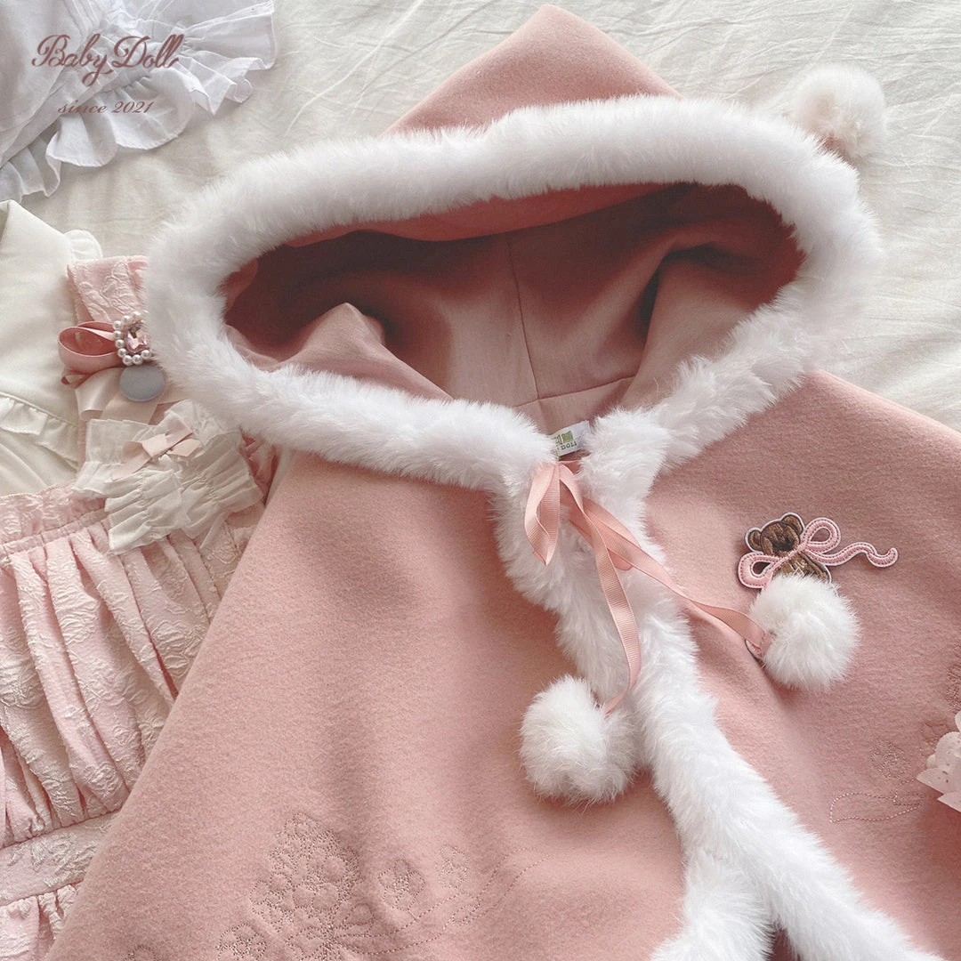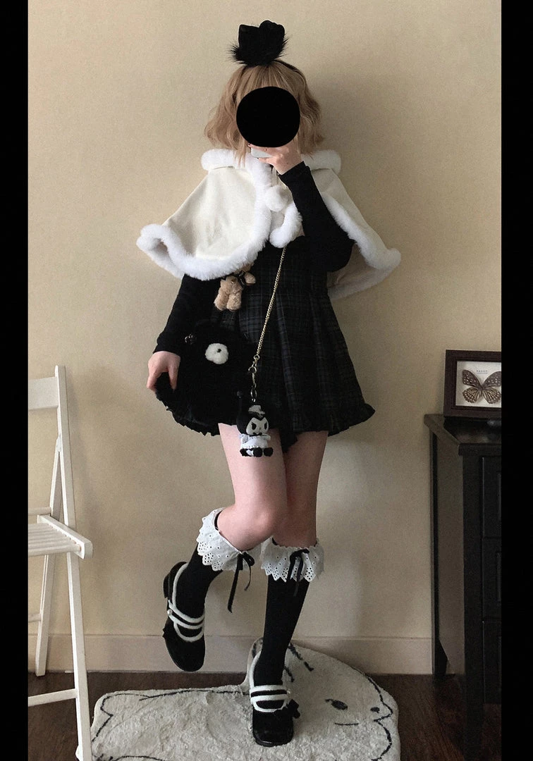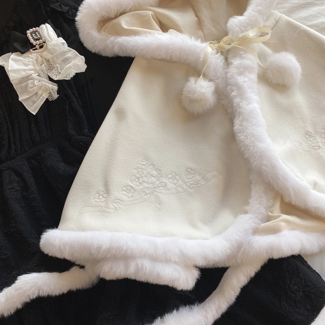 Cape with hat: length: 40cm, shoulder: 35cm, made with faux fur.