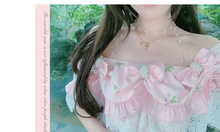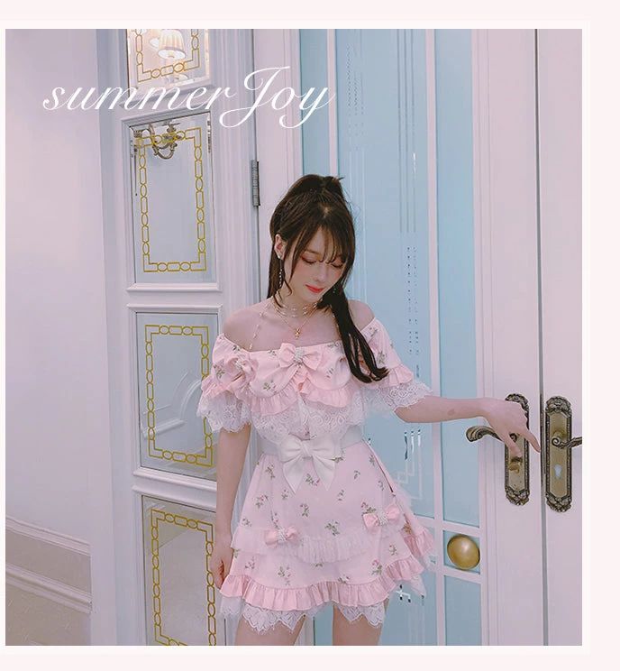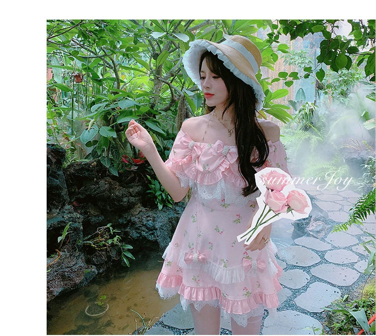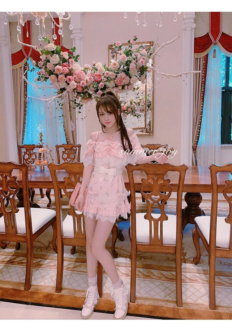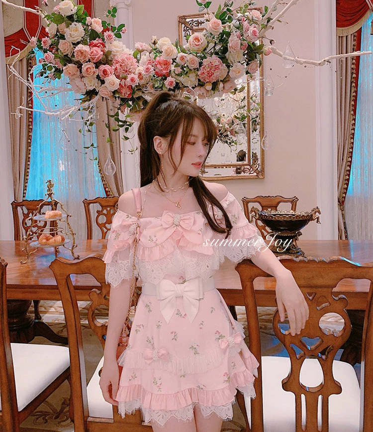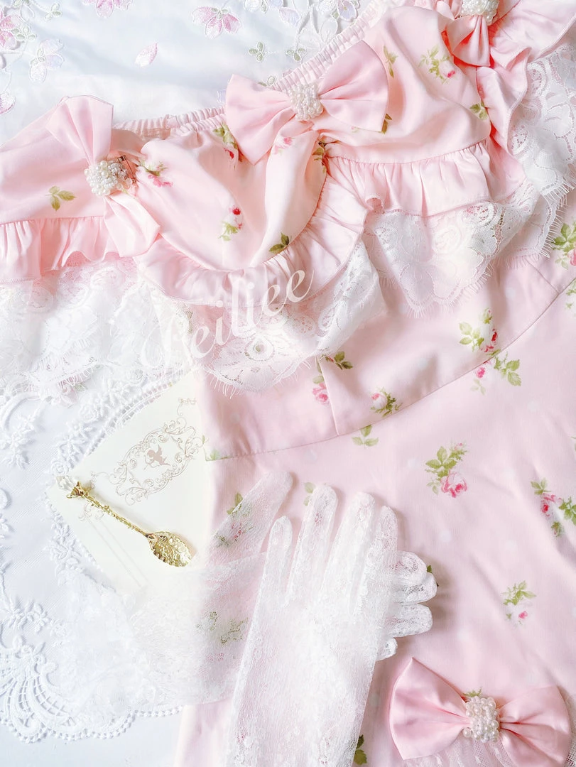 Sweet princess styled shoulder cut with flower prints with 6 lovely floral ribbons pin for decorations
